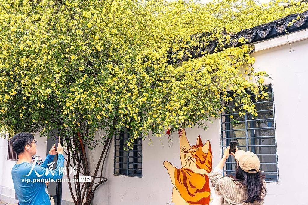 2026年4月6日,江苏苏州阔家头巷,黄色的木香花与墙绘相映成趣。张锋摄(人民图片网)